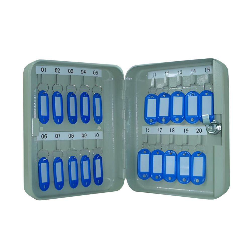 Armario metálico para 20 llaves. Incluye 20 llaveros portaetiquetas y numeración identificativa de cada gancho. Cerradura con dos llaves y elementos de fijación a la pared (tacos y tornillos). Medidas: 20 x 16 x 60cm.